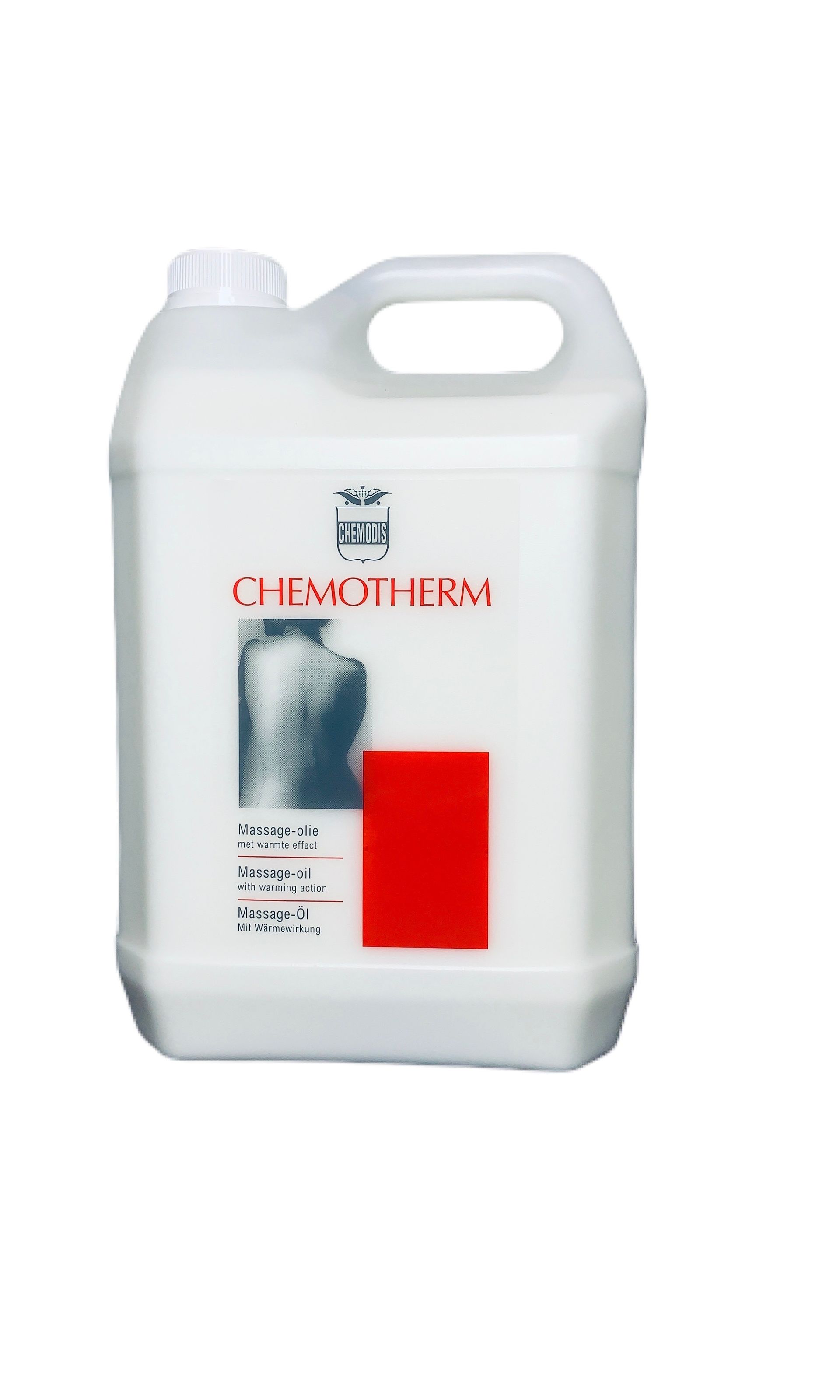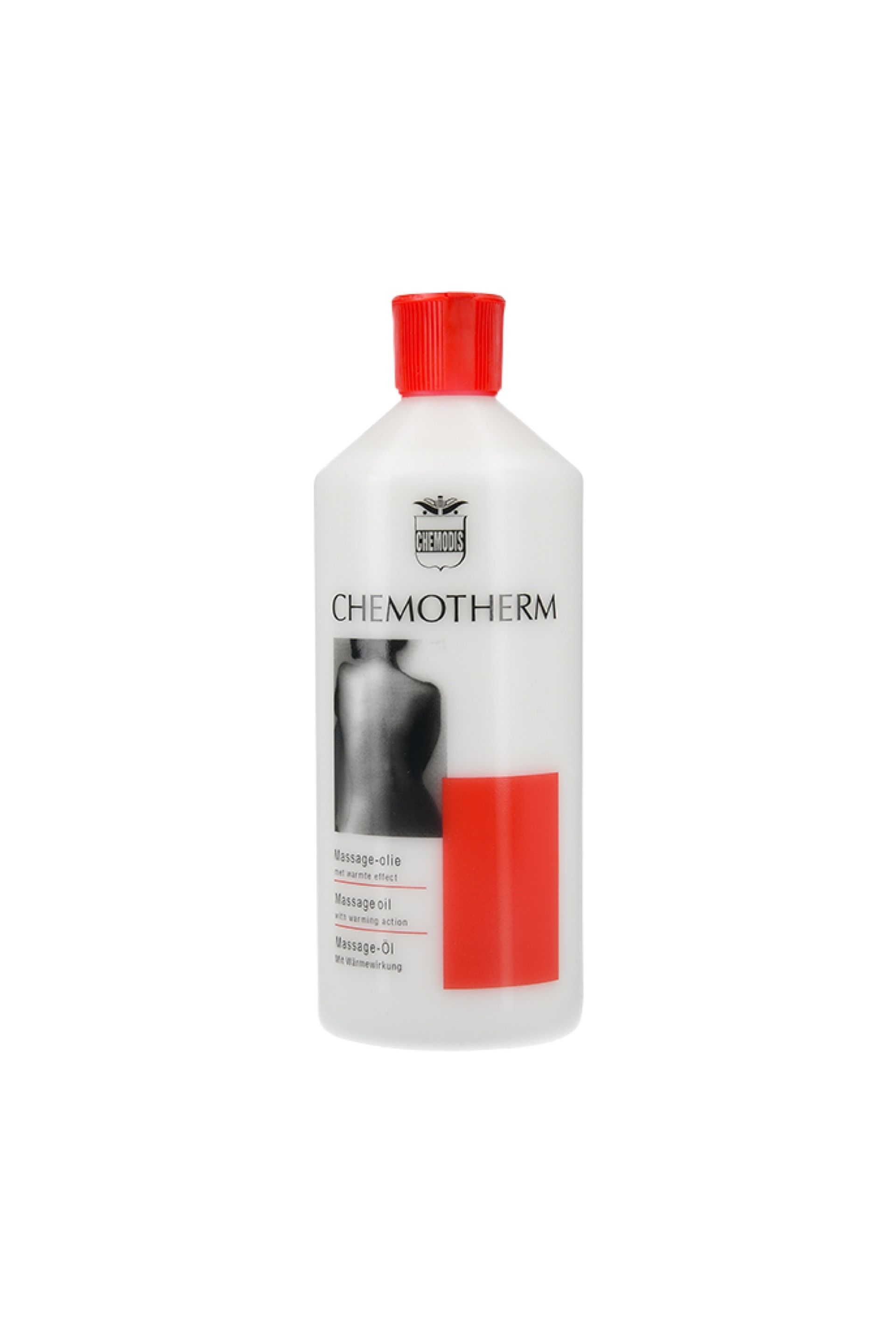 Massage oil with mild heat effect. Chemotherm is a massage oil with active ingredients that have a mild and responsible warming effect on the skin. This makes Chemotherm ideal for activating massages, but also a safe aid for warming up in sports. This massage oil gives a pleasant long-lasting warmth after the massage. This feels especially beneficial to the older patient. Due to the mild composition, this oil does not irritate the masseur's hands. Chemotherm is easy to remove with water.